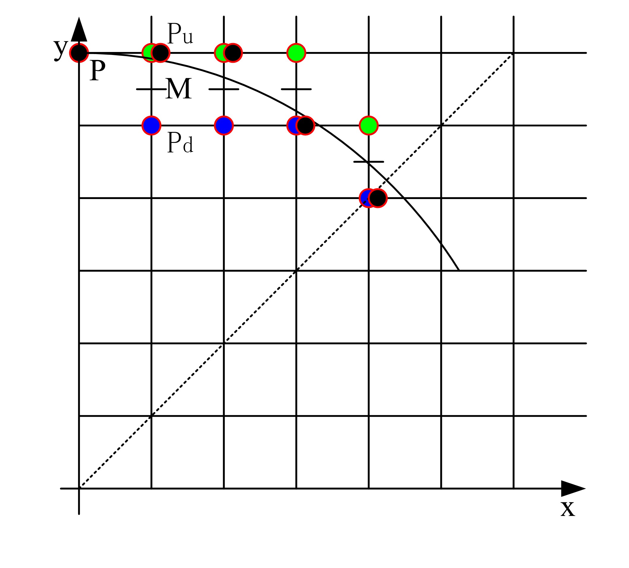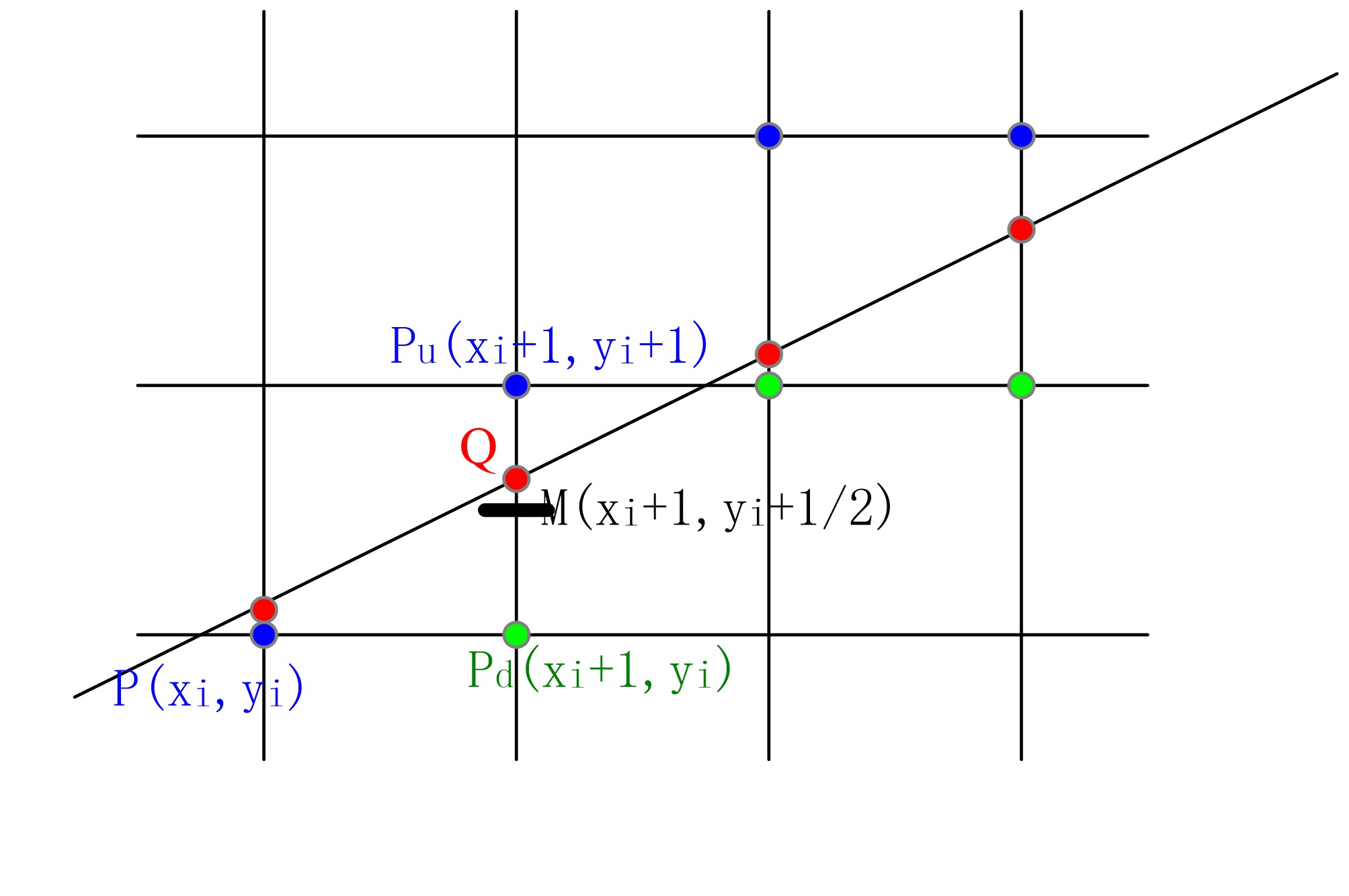 \begin{equation} \begin{split} d_0&=F(x_0+1,y_0+0.5) \\ &=y_0+0.5-k(x_0+1)-b \\ &=0.5-k \end{split} \end{equation}# 改进的 Bresenham 算法