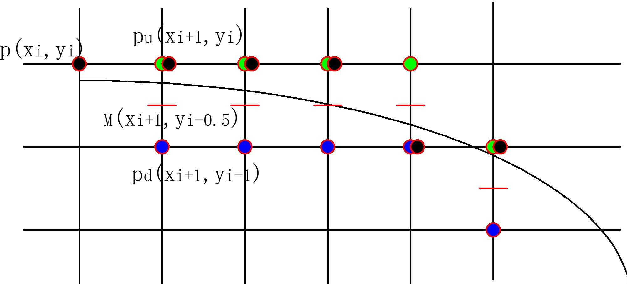 \begin{equation} \begin{split} d_2&=F(x_i+0.5,y_i-2) \\ &=b^2(x_i+0.5)^2+a^2(y_i-2)^2-a^2b^2 \\ &=d_2+a^2(-2y_i+3) \end{split} \end{equation}用上半部分计算的最后点 来计算下半部分中误差项的初值: