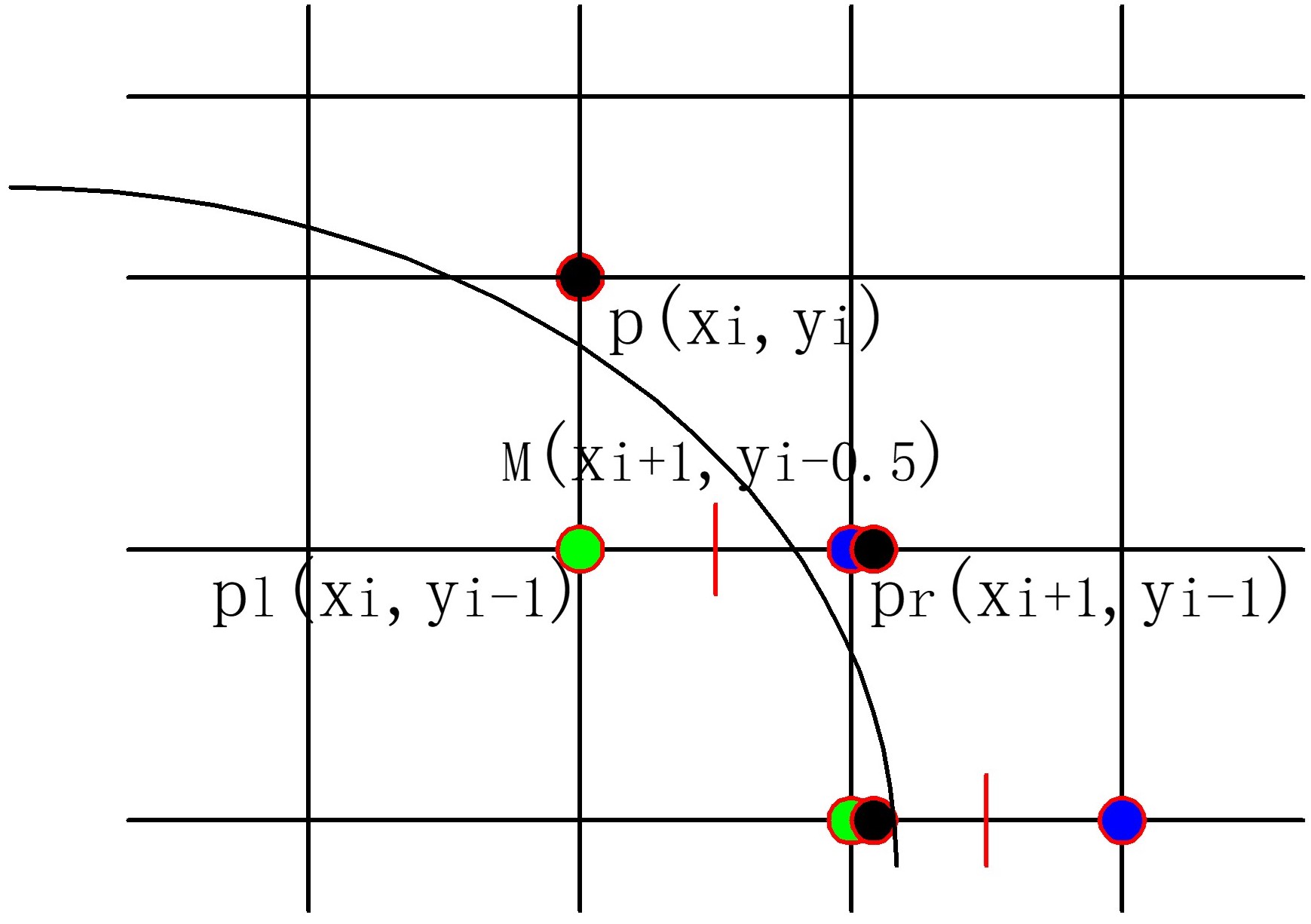 \begin{equation} \begin{split} d_{i+1}&=F(x_i+2,y_i-1.5) \\ &=(x_i+2)^2+(y_i-1.5)^2-R^2 \\ &=d_i+2(x_i-y_i)+5 \end{split} \end{equation}初始值 的计算: