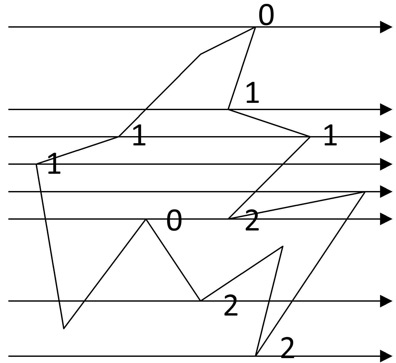 检查顶点两条边的另外两个端点的 Y 值,两个 Y 值中大于交点 Y 值的个数是 0,1,2,来决定取 0,1,2 个交点
