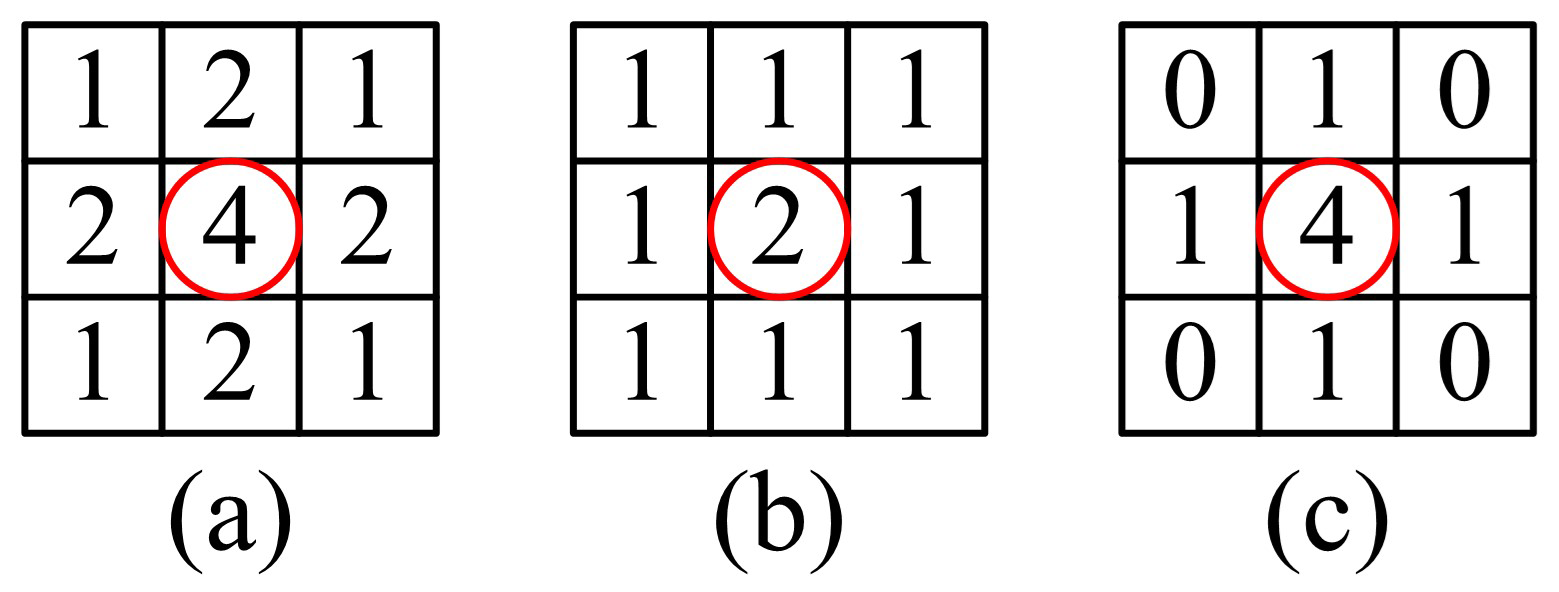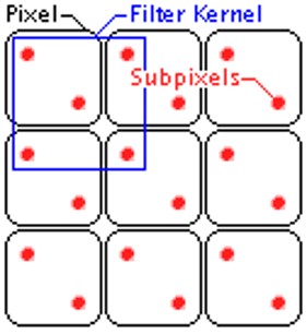 - 基于加权模板的过取样:前面在确定像素的亮度时,仅仅是对所有子像素的亮度进行简单的平均。更常见的做法是给接近像素中心的子像素赋予较大的权值,即对所有子像素的亮度进行加权平均