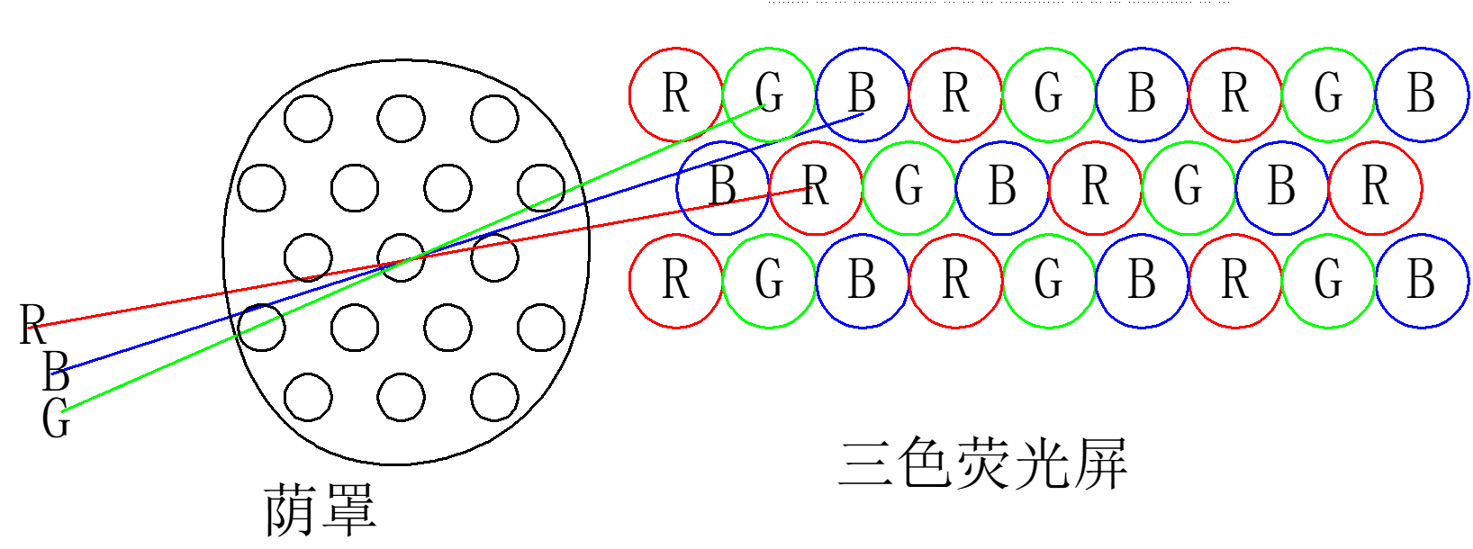将能够发出红绿蓝三种颜色的荧光粉涂在荧光屏上。荧光粉受到不同强度的电子束激发使发出的色光产生混合形成彩色图形![荫罩及彩色显像管上荧光小点的排列]()