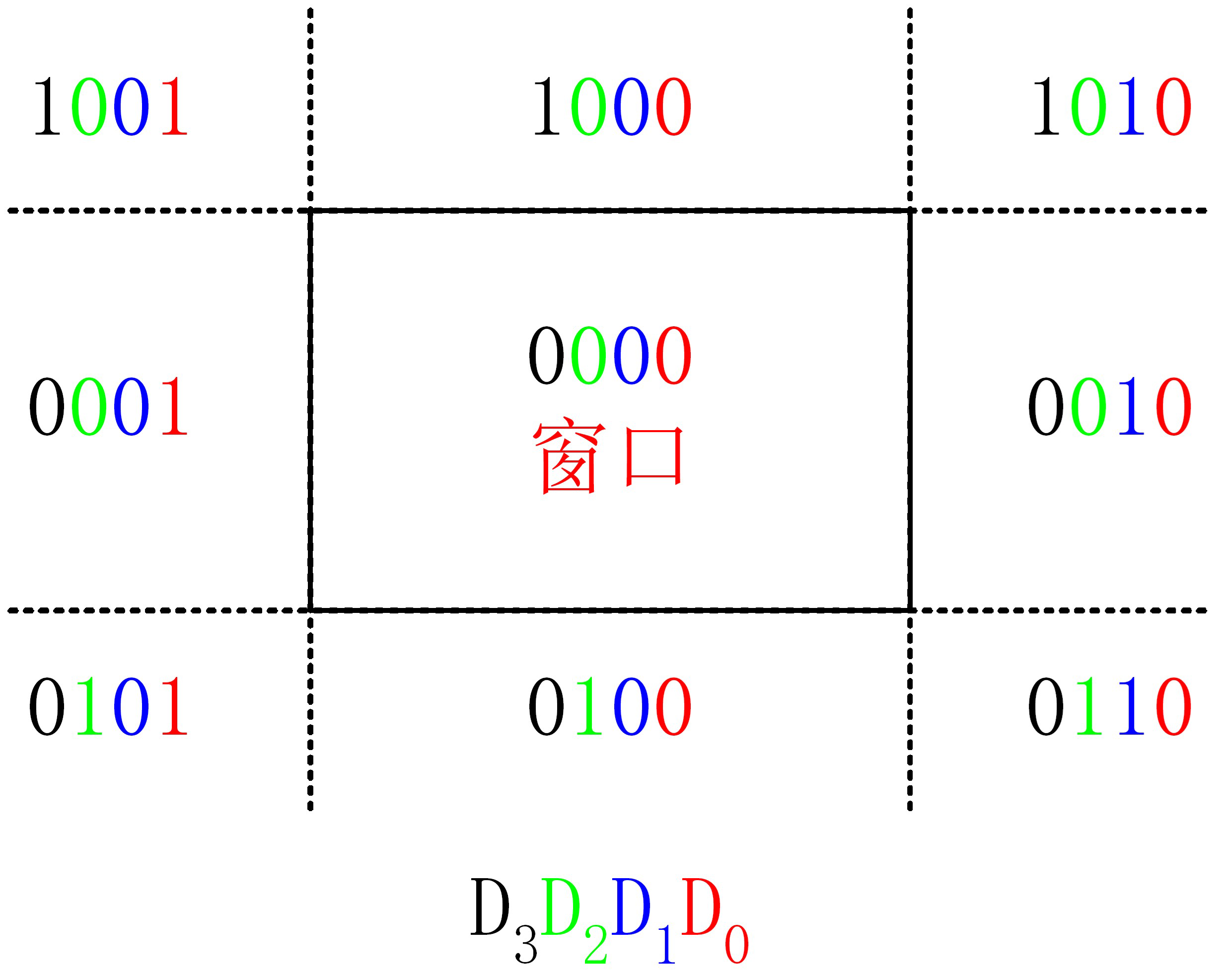 编码:对于任一端点,根据其坐标所在的区域,赋予一个 4 位的二进制码