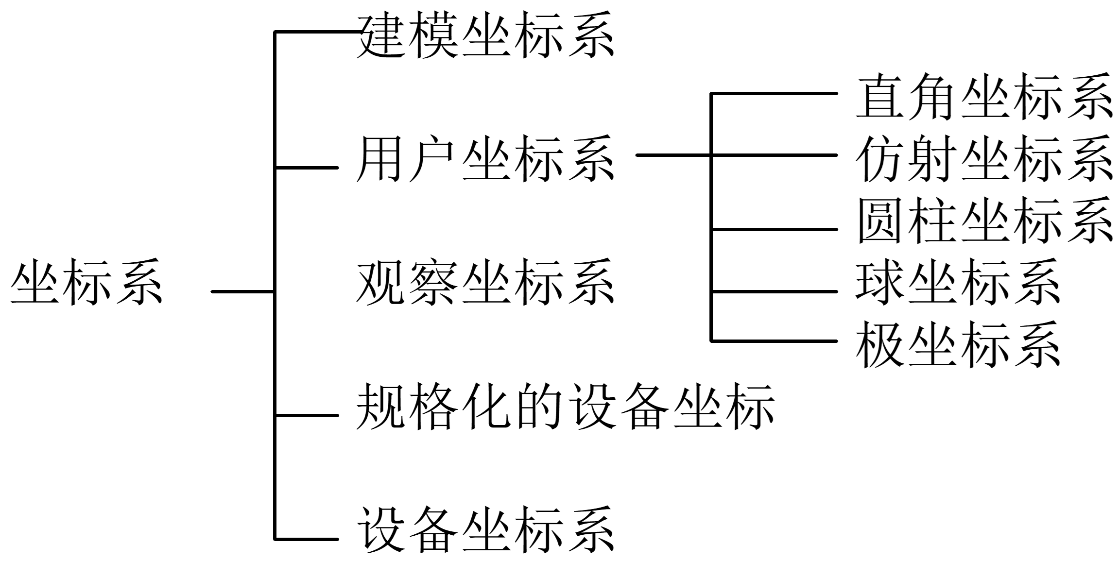 - 用户坐标系:也称为世界坐标系,用千定义用户的整图结构或最高层图形结构,各种子图、图素经调用后,都放在用户坐标系的适当位置。用户可根据应用的情况选择相应的坐标系,如直角坐标系、仿射坐标系、圆柱坐标系、球坐标系和极坐标系等
