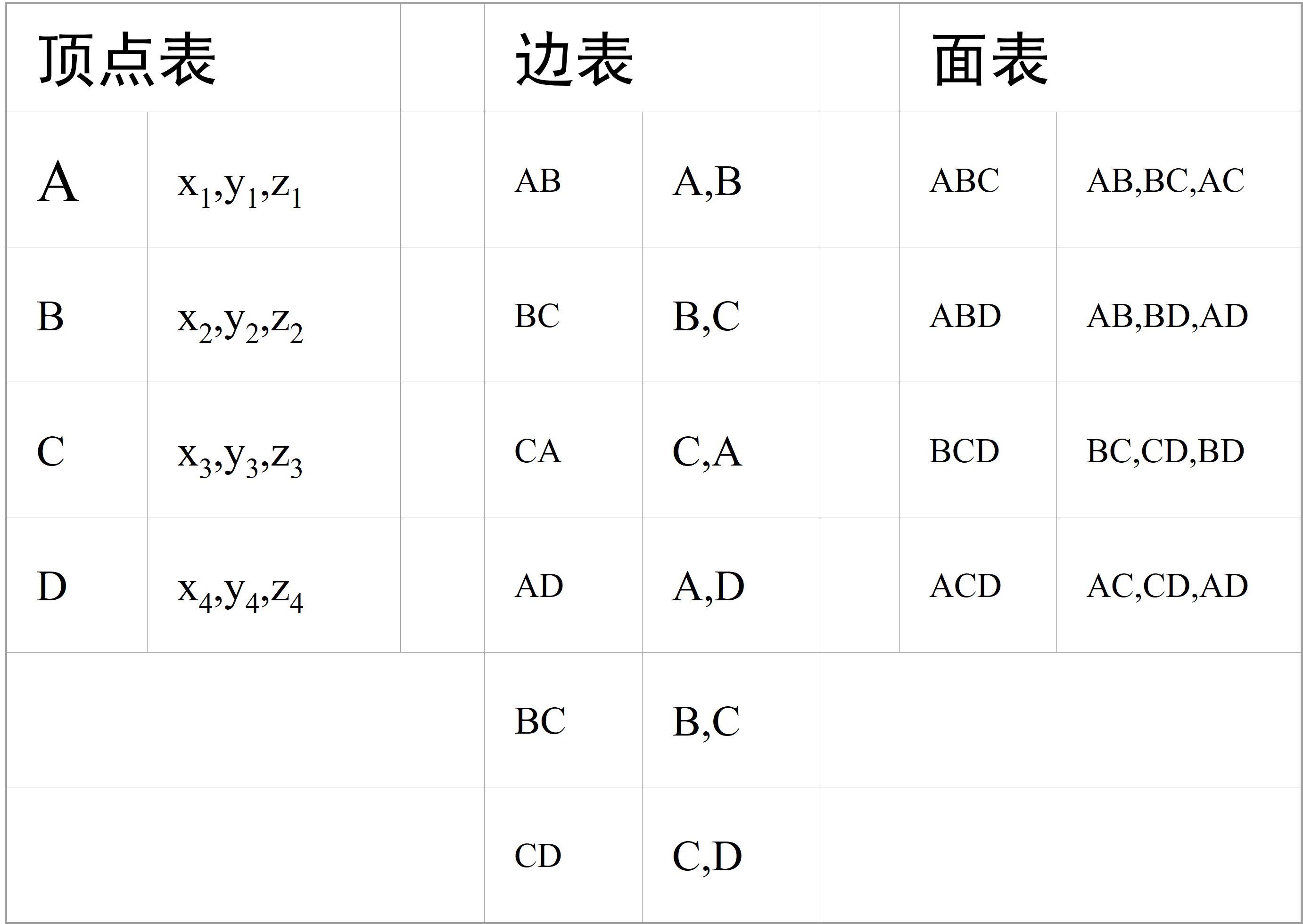 - 属性信息:用属性表来存储多边形面的属性,指明物体透明度及表面反射度的参数和纹理特征等等